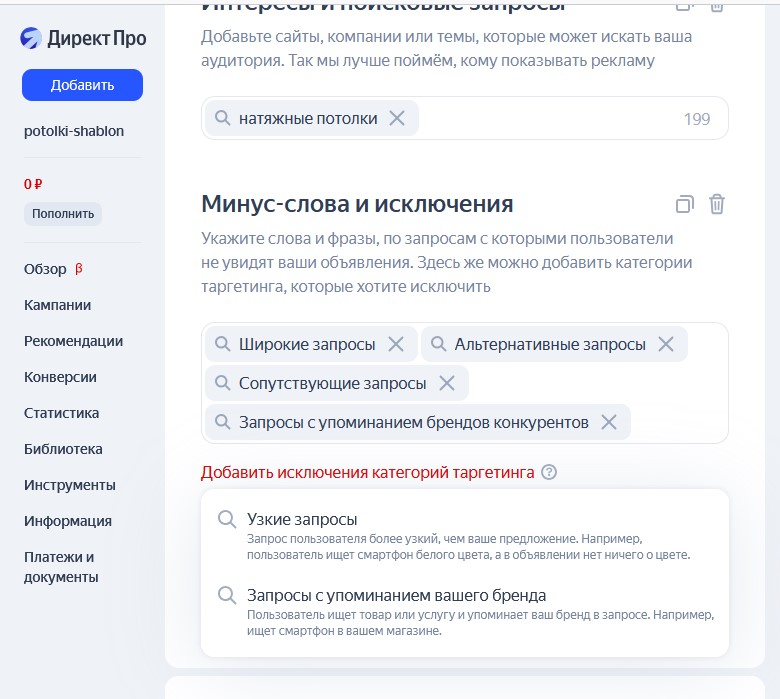 Оставьте только целевые. Если, например, речь о натяжных потолках, все фразы должны содержать в себе «натяжные потолки». И никаких окон, дверей, ремонтов, дизайнов. Все это вы можете пробовать добавлять на этапе расширения аудитории, но только после того, как аккаунт заработает эффективно.
