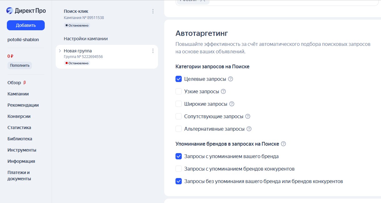 А в ЕПК по РСЯ автотаргетинг отключается на странице настройки Группы объявлений. В общем выключаете доступным способом – результат один. Яндекс постоянно экспериментирует с интерфейсом Директа, т.е. разные аккаунты в одно и то же время могут выглядеть по-разному и иметь разные опции. Поэтому учитывайте возможные изменения в интерфейсе.