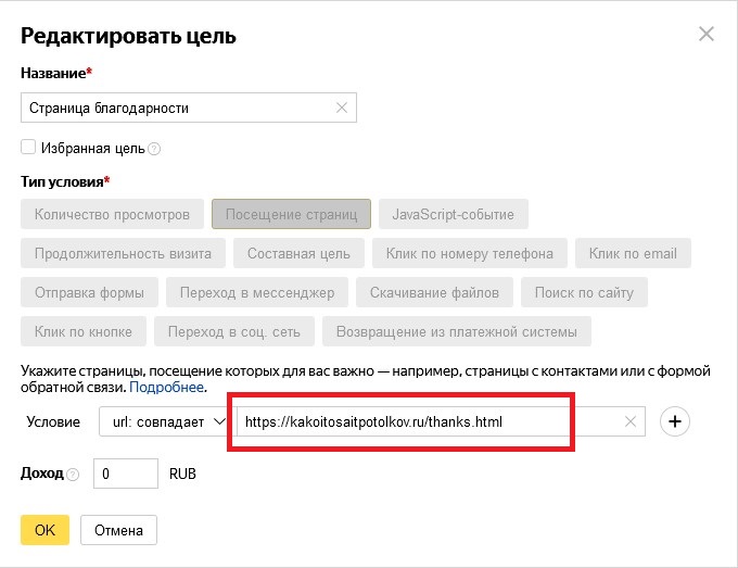 Поэтому никогда не используйте автоматические цели Яндекс.Метрики. А настраивайте две самые надежные цели: посещение URL Страницы благодарности и JavaScript-событие Заявка отправлена. URL копируете в адресной строке Страницы благодарности вашего сайта.